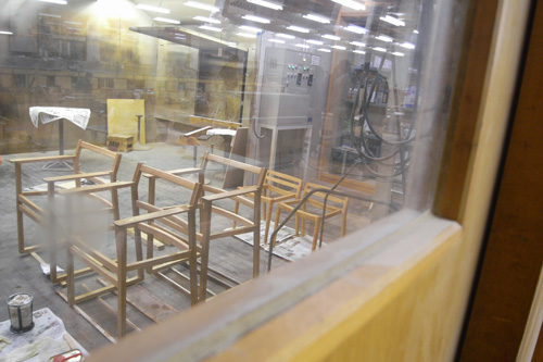 試作の1脚はエアーボーリングマシーンというダボ用の穴を開ける機械を使ってダボで組み立てました。
