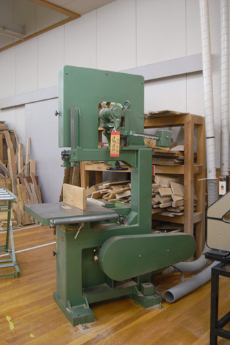 背の部分もバンドソーで大まかにくり抜いて、型紙をスプレーのりで貼って、ベルトサンダーできれいにします。