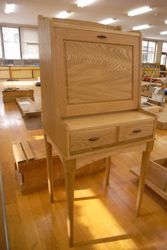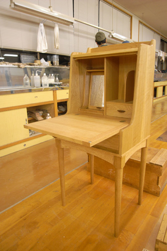 今回のは横から見たときに転んでいる脚です。そういう脚のほぞ加工をやってみたかったからです。ちょっとでも機械の角度のセットが違うときっちりくっつきません。またまた勉強になりましたー。四方転びはもっと複雑なので、やると頭と精度が足りなそうです。
