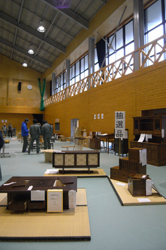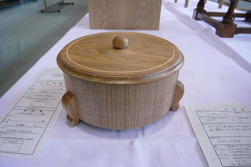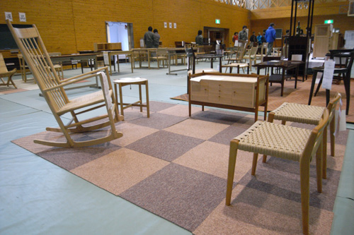 奥のテーブルには木材工芸科の作品が並んでいます。