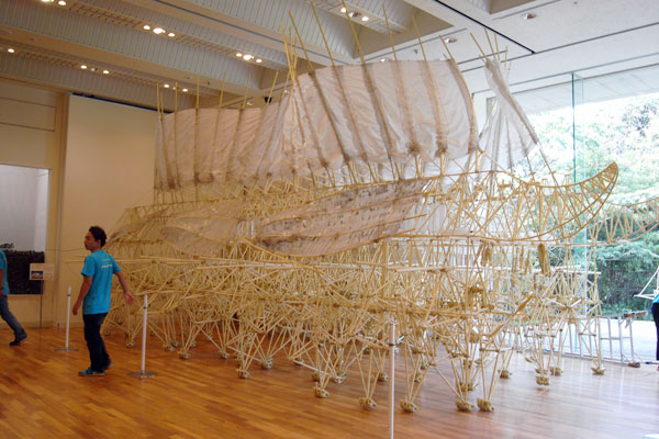 ビーチアニマルとは風をためて圧縮させてその力で動く「風を食べる」生き物。 電力もガソリンも使わず動きます。見た目ロボットみたいなのにすごい。 展示がおもしろかったです。 壁にずーっと文章が書いてあったり、照明もビーチアニマルと同じ部品で作られていたり。 写真も撮り放題。 ビーチアニマルはずっと進化し続けているらしく、その系譜とかも書いてあってほんと生き物みたい。 (ゾウさんは外にいたやつでテオの作品ではありません) 動かなくなったものは「化石」として展示してありました。 会場は、普通の美術展とは違って子供連れが多かったです。 で、見たかったデモンストレーションは、動画を撮りそこねましたが カシャカシャ動く脚は動物そのものでした。なんか関節がリアルで。 翼もバッサバッサうごいて迫力ありました。 しかし室内だったのでコンプレッサーで空気入れて動かしてました。 ほんと言うと、外で動いてるのを見たかったですね。 普段はオランダの砂浜にいるとかで、水を感知したらバックするんだそうです。 風で倒れないように自分で砂浜に杭を打って固定するやつもいました。すごくない!? 関節。こんなプラスチックのチューブの組み合わせでできています。 そのほかペットボトルに透明テープ、そしてこの結束バンド…なんか手作り感あってほっこりします。 こういうこと考える人がいるんだよな~。おもしろい。 そんなこんなで久々の美術館めぐりでした。 PR 2011/09/18(Sun) 11:50:10