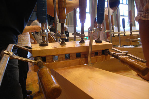 行ってきました。初削ろう会! 2日間の内の1日だけですが、初めてなのでわくわく。 17日の仕事が終わって、仮眠をとって出発! 国取りもしつつ到着です。 削ろう会は、鉋の削り花をノギスで測りその薄さを競う大会。 それはもう刃の研ぎも台の仕込みも究極の世界です。 全国の大工さんや道具やさんの参加が多いかな? が!メインの薄削りは2日目なので私は見れません。雰囲気だけでも楽しもうと会場に入ると、 中はもうセッティングがしてあって、削ってる人もいました。女性の大工さんが助手。かっこい~。 会場ではいろんなイベント・実演がありました。 これは鑿の仕上げをすべてやすりがけして仕上げてるところ。田斎明夫さん。 この使い込まれた作業台のいろんなとこを使って磨いていっています。 これは鋸の目立て。小林實夫さん。80歳だそうです! 鋸の目立てはハマグリに研ぐのだそうです。長切れするように。 これは鉋の台打ち。梨屋木工所 渡辺富士男さん。 台は…自分で1回作ってみて勉強したほうがいいかもですね。 理屈ではわかっても実際は出来なさそう。みんなよく作れたよねって、上松の思い出にふけったり。 みなさん普段の仕事場とは照明が違うわ質問攻めに合ってしゃべりながら作業しなきゃいけないわで、 とってもやりにくいはずなのに嫌な顔せず丁寧に説明してくれます。 もっとも気難しい人は来ないんだろうけど。 それにしても高齢化ですね。 職人技が消えていくのが心配ですが、参加者にはけっこう若い人も多かったです。。 これは木工界のF1レーサー山本文義さんの講演「狂いの少ない鉋台」にて。 すごい!5枚剥ぎくらいの台にアルミの角パイプが埋め込まれています。 (削ろう会などで薄削りするための台なので、下端を削ったりっていうのはあまり考えないそうです。) 1日目のイベントとして逆転の発想「厚削り大会」があったのですが、 眠たくなってきたのでまた今度です。 そういえば、入り口で「丸太からすべて手加工で家を作る」という過程を収めたDVDを販売してて、 そこでかわいい手ぬぐいを見つけてまた買っちゃいました。(DVDも半分買った…) それではまた。 2010/09/25(Sat) 00:55:32