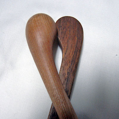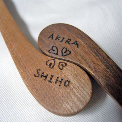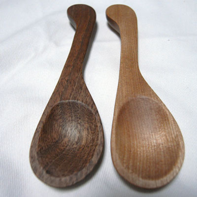 去年作ったスプーン。名づけてヒラメスプーン! ピンクは樺、茶色はウォールナット。 なんでヒラメかというと持ったとき先が左に寄っているから。 柄の先を手のひらで包み込むように持つと、スープとか、くるくる混ぜやすいようになっています。 右利き用です。 右に寄った左利き用も作っています。それの名前はもちろんカレイスプーンです。 そしてこんな風に置くと、 ハート♥ ![]() に見えるかな?しかもなんかチューしてるような? そう見えたので、友達の結婚お祝いにいいにゃ!とペアスプーンとしてプレゼントしました。 しーたん&あきちゃん ハートを並べて四葉のクローバー風に。 でも、この子確か左利き…。 2012/01/18(Wed) 22:20:43
