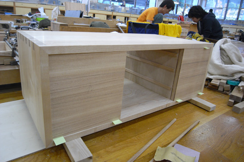 扉は桐材をタモで縁取ったものをさらにタモの単板で挟んでます。縁の留め加工が細かい作業でした。